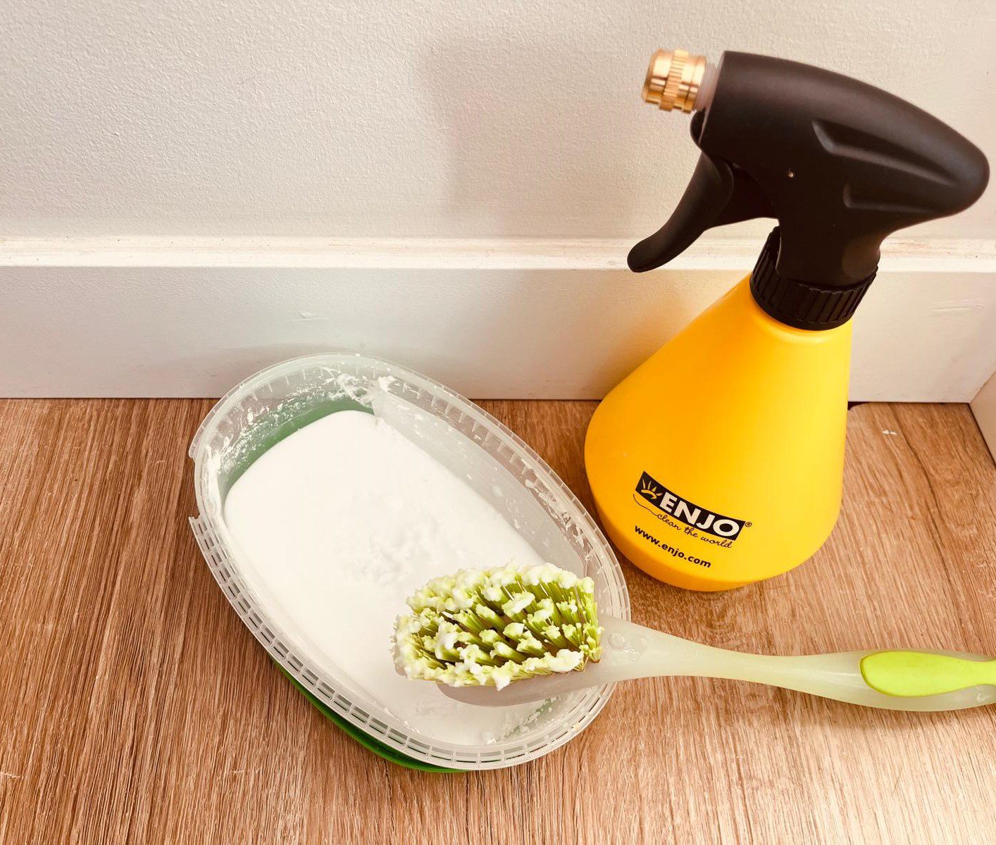 With a soft brush or soft scrub sponge, add a small amount of paste to your tool, mist water on top of the paste.
